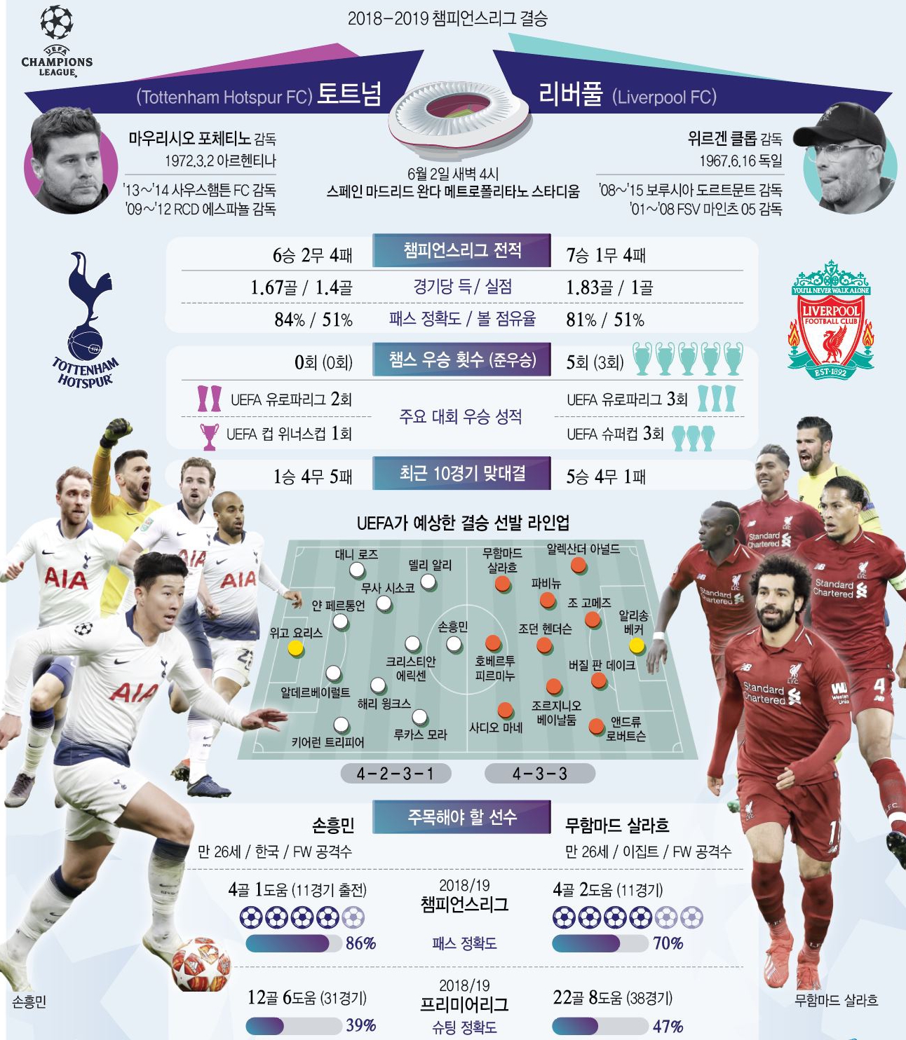 객관적인 전력은 리버풀이 앞서지만 챔스리그 결승전은 분명 다르다. 단판 승부라는 점에서 리버풀 클롭 감독과 토트넘 포첸티노 감독의 지략 대결이 어떻게 펼쳐질지 관심이다. 리버플은 전방에서부터 적극적인 압박을 시도하는 스타일이다. 모하메드 살라(22골), 사디오 마네(22골), 피르미누(12골) 삼각편대를 앞세운 맞춤형 전술의 공격축구는 리그 최강으로 손꼽힌다.