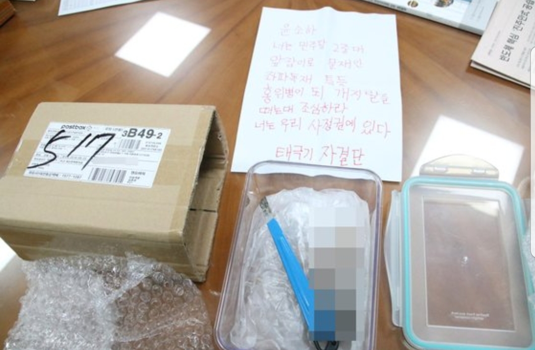 편지에는 "윤소하 너는 민주당 2중대 앞잡이로 문재인 좌파 독재의 특등 홍위병이 돼 XX를 떠는데 조심하라. 너는 우리 사정권에 있다"는 협박 내용이 담겨 있었다. 편지를 보낸 이는 자신을 '태극기 자결단'이라고 소개했다.
